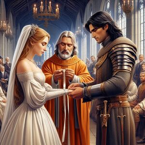 Bevor mit der eigentlichen Travia-Zeremonie begonnen werden konnte, sollte die junge Braut noch ihren Ritterschlag erhalten. Bis dies geschehen war, stand sie noch unter Schirm und Schutz ihres Schwertvaters, dem erfahrenen Recken Gunnolf Flaß von Cresseneck, dem Vogt der Burg Rubreth, der sich bei der Abwehr der Kaisermärker Belagerung Rubreths im Blutigen Jahr als meisterlicher Schütze einen Namen gemacht hatte. So kam es, dass Duridanya von Luring nicht im einfach Knappengewand, sondern in ihrem Brautkleid vor die Rondra-Geweihte Alwene von Grenstade trat. Obschon selbst im klassischen Kettenhemd angetan, schien Ihro Gnaden den ungewöhnlichen Aufzug der Knappin nicht im Mindesten zu missbilligen. In einer feierlichen, wenn auch recht uninspirierten, Zeremonie, wurde die junge Luringerin mit Schwert und Sporen gegürtet. Fast konnte man den Eindruck gewinnen, Ihro Gnaden hätte schlecht geschlafen. Alles hielt den Atem an, als schließlich der Punkt kam, an dem Ritter Gunnolf seiner Knappin den letzten Schlag verpassen sollte, den sie im Leben unerwidert lassen musste. Zur allgemeinen Erleichterung beließ er es bei einem symbolischen Klaps auf die Wange, bevor er sie herzlich in die Arme schloss, um der Erste zu sein, der sie in ihrem neuen Stand als Ritterin willkommen hieß.